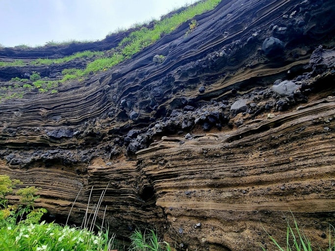 지질트레일을 따라 걷다 보면 화산 퇴적층, 화산탄, 응회암 등 자연이 만든 예술작품들이 펼쳐지며 탄성을 자아내요. 🌋